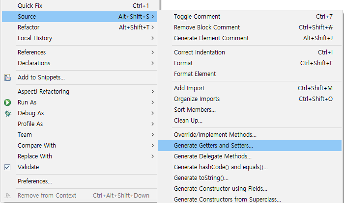 필드에 오른쪽 클릭 Source > Generate Getter and Setters 체크박스 모두 체크 OK