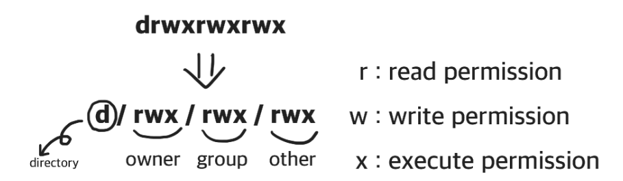 # 이어지는 r, w, x는 각각 read(읽기) / write(쓰기) / execute(실행) permission 권한을 나타낸다.