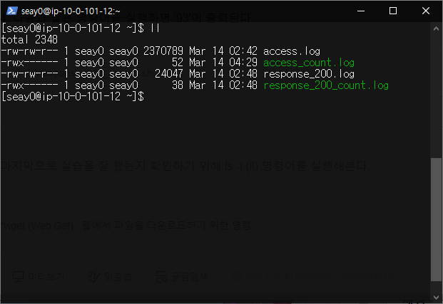 2. 'response_200.log'의 필터링된 로그가 총 몇 줄인지 출력하는 파일인 'response_200_count.sh' 를 생성한다.