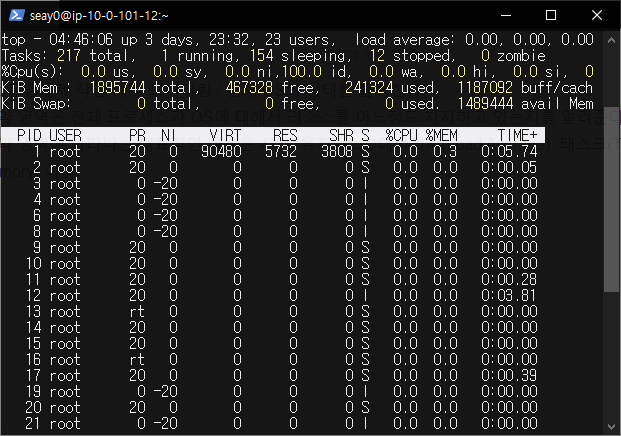 - 요약 영역에 나타나는 대표적인 내용은 시간, 유저, 로드 애버리지(Load Average), 태스크(Tasks), CPU, 메모리(memory) 이다.