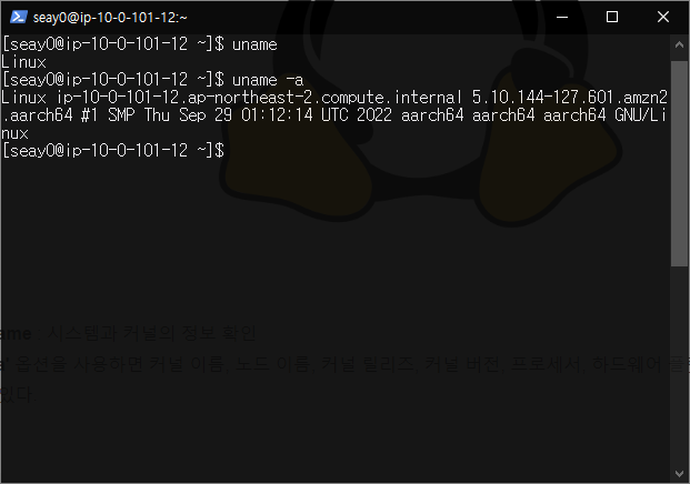 - '-a' 옵션을 사용하면 커널 이름, 노드 이름, 커널 릴리즈, 커널 버전, 프로세서, 하드웨어 플랫폼, 운영체제 정보를 알 수 있다.