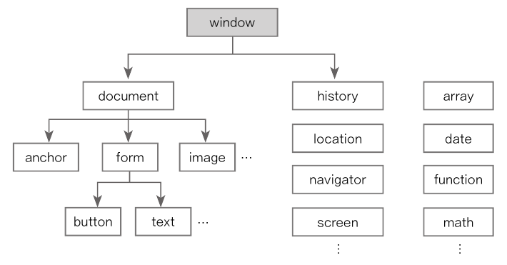 - 하위에 웹 브라우저 창의 각 요소에 해당하는 객체들이 만들어진다.