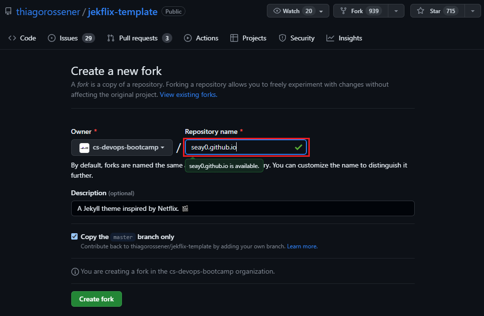 Repository name을 본인 github의 user name.github.io 로 변경한 후 Create fork를 클릭한다.